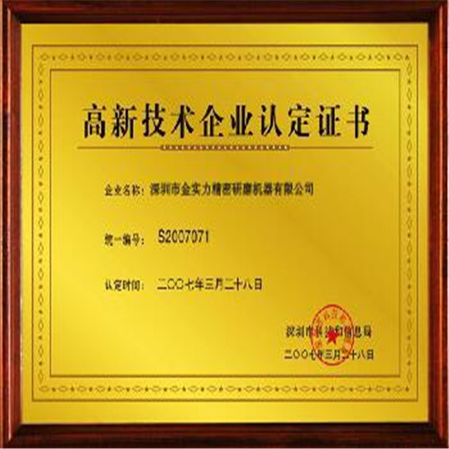 高新技術企業認定證書 日期:2016-10-11 / 人氣: 深圳市金實力精密研磨機器有限公司經過全員上下不懈地努力,現已成為榮獲高新技術企業認定證書。 編輯:admin 上一篇:企業稅務登記證 ← 下一篇:深圳知名品牌榮譽證書 →